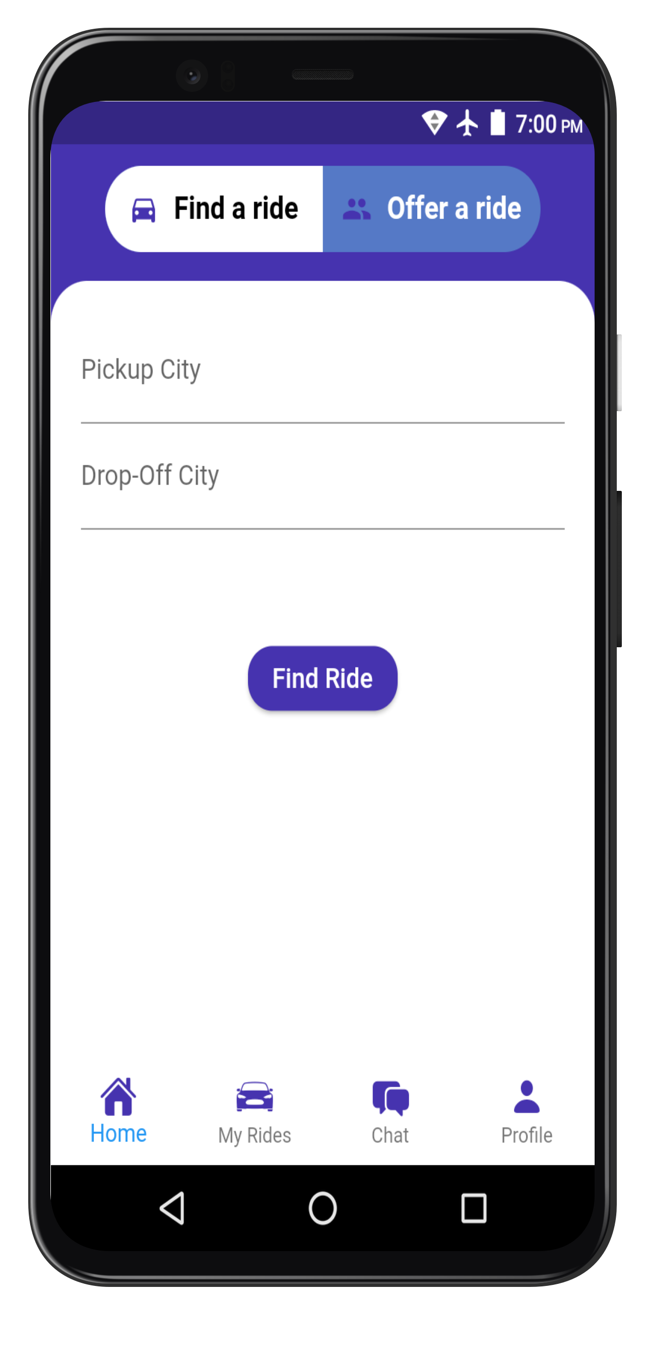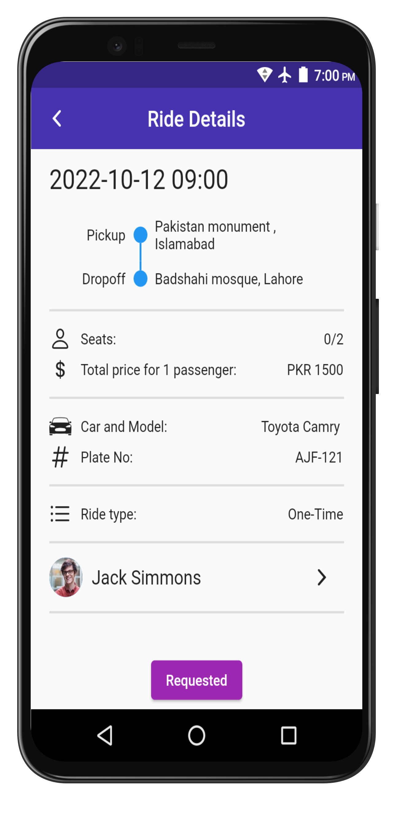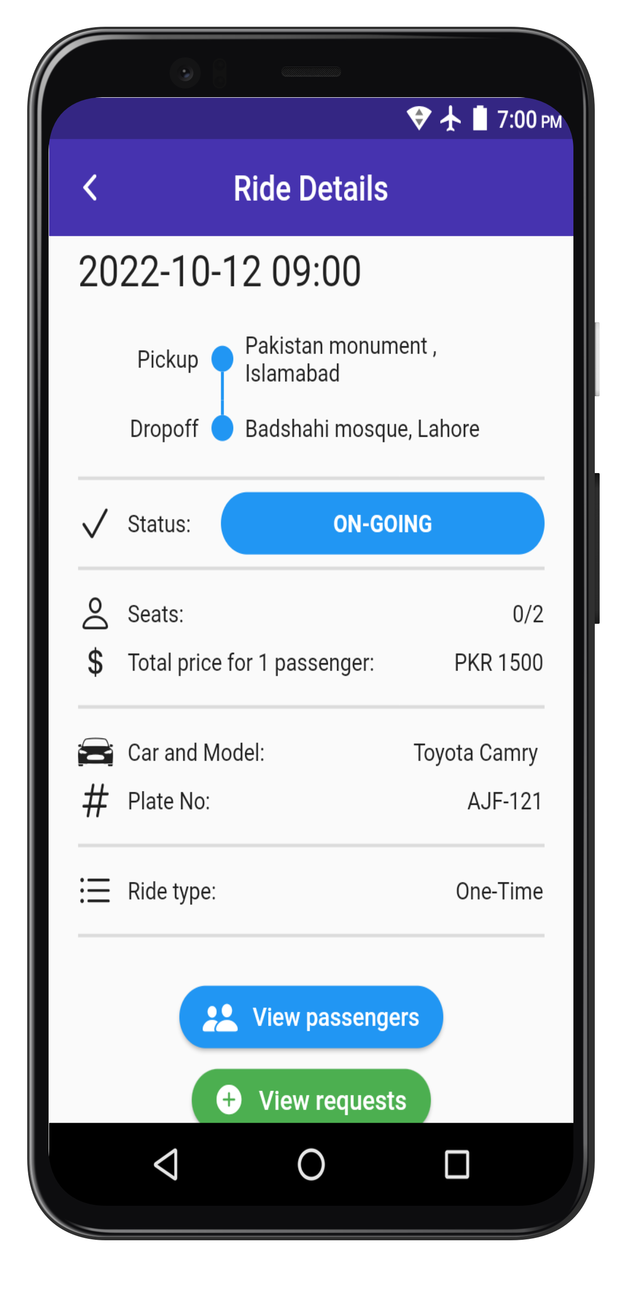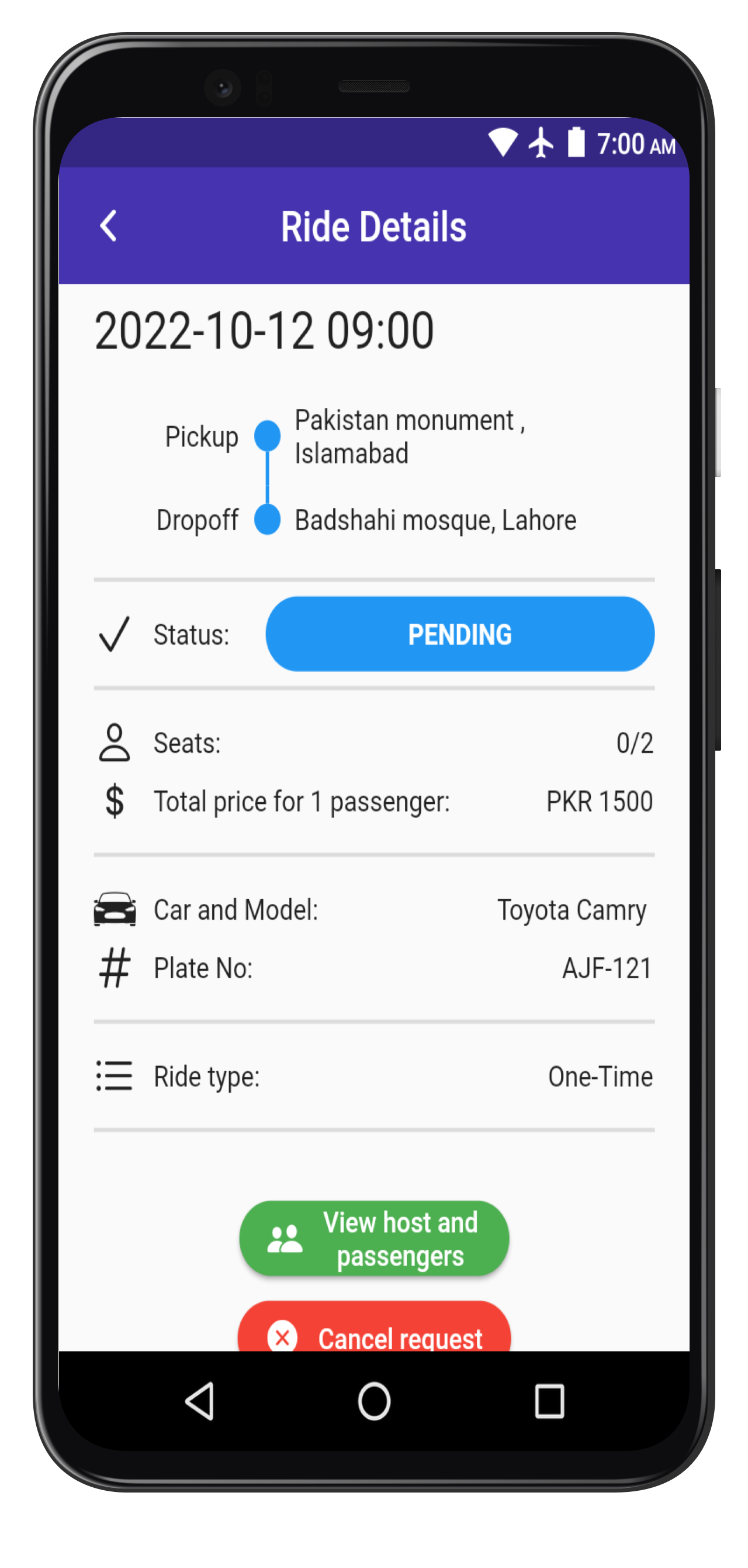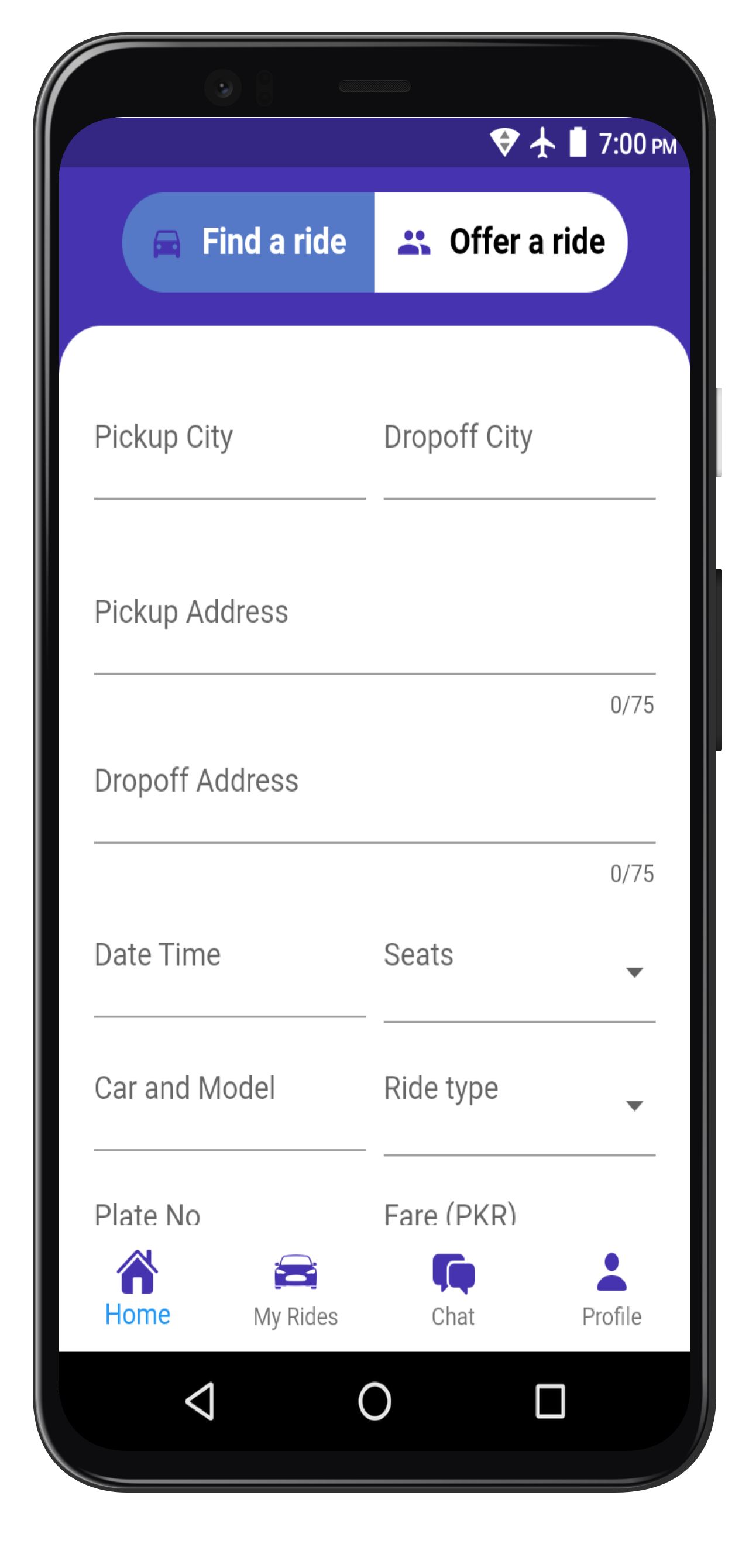 Humsafar provides a well designed and ergonomic layout for you to request or offer rides.